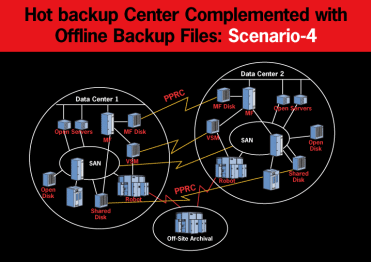 热备份要求同步数据的快速恢复,费用很高,实施复杂。但是该策略必须有离线存档备份和定点存档的支持,否则就不是一个真正意义的灾备了。这一点很重要,离线的灾备是防止破坏、敌意的病毒袭击、应用失误等的有效方式。因此,如果客户有必要实施热备份的灾备方案,StorageTek会建议客户同时采用离线的远程灾备方案(如下图所示),从而确保数据的100%安全。