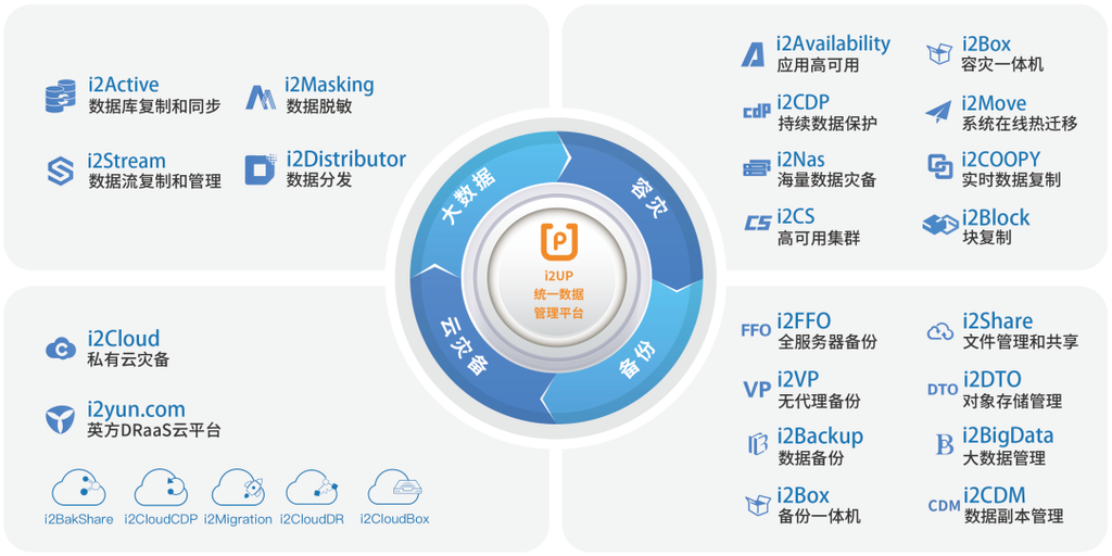 英方拥有业界齐全的数据容灾方案,通过统一的数据管理平台i2UP,企业不仅能够实现对海量图片、视频、日志等非结构化数据,以及各类数据库(如Oracle、MySQL、SQLServer、GaussDB等)和大数据平台相关(Hadoop、Kafka、Kudu等)的数据/消息进行实时数据同步、备份、CDP及容灾保护,且整个传输过程加密传输,安全可靠,可以从本地到同城、到异地或云端,支持物理机、各类虚拟机平台的迁移和保护。实现各类型文件/系统端到端的安全保护,避免网络攻击、误删、单一硬件设备故障造成的数据损坏和业务停止。
