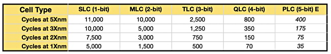 单元存储NAND比特位越多,耐用性就会降低。QLC NAND与TLC NAND相比,读写比特位需要更长的时间,并且QLC比TLC单元的寿命短。PLC的情况更差。