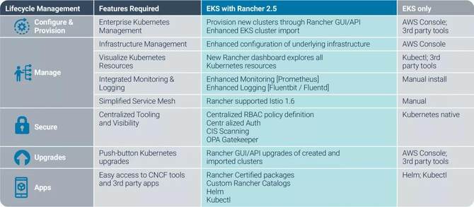 Amazon EKS是全球最受欢迎的云托管Kubernetes发行版,Rancher与EKS的合作由来已久,Rancher 2.0是业界首个支持Amazon EKS集群托管的Kubernetes管理平台。随着Rancher 2.5的发布,双方的合作进一步加强,Rancher 2.5成为了业界首个且唯一一个对EKS集群提供全生命周期管理的产品。Rancher 2.5与Amazon EKS的紧密协作,增强了Rancher对流行的云托管Kubernetes发行版的市场领先支持。当然,对EKS的支持只是一个开始,我们后续会相继推出其他公有云Kubernetes的全生命周期管理。