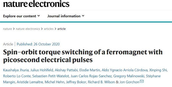 近日在《自然·电子》(Nature Electronics)杂志上发表的一篇论文中,由法国、美国学者合作领导的国际研究团队宣布研发出了一种新的磁化“开关”技术(将信息“写入”到磁存储器的过程),其切换比最先进的自旋电子设备快近100倍。