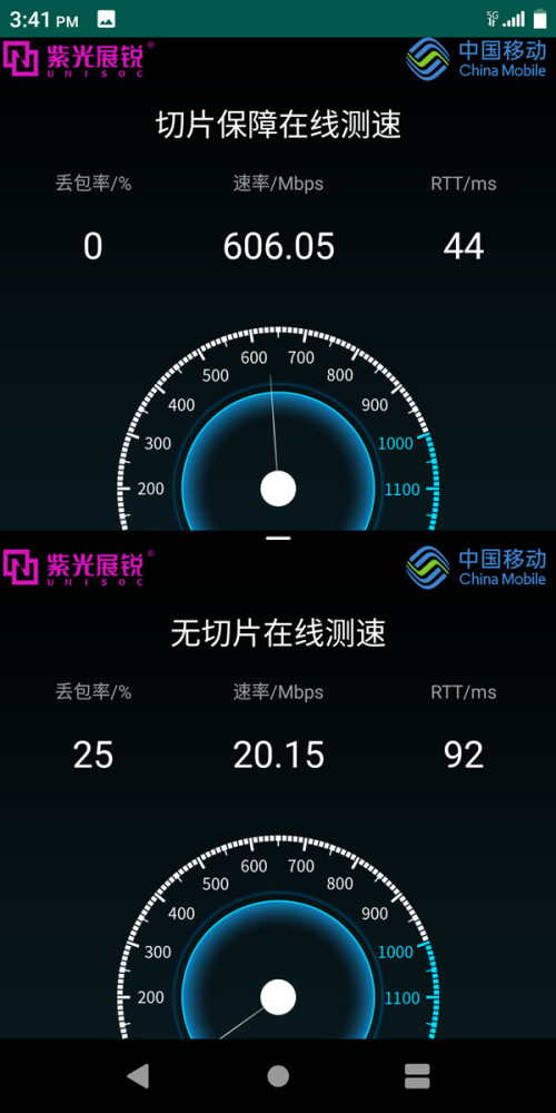 本次演示利用在线测速业务场景,直观展现了无切片网络接入与切片保障网络接入的业务体验对比,从下行峰值速率、丢包率、时延等视角全方位展示了切片技术在保障5G典型业务时的卓越表现,完整实现了5G终端切片目标方案和调制解调器中心化方案。演示结果显示,即便在模拟网络拥塞状态下,5G切片用户仍旧可以享受到流畅的下载速率、极低的丢包率和超低时延业务体验。