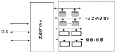 图一说明NAS从结构上可以分解为控制器部分、网络部分、存储设备三部分;存储设备可以是RAID磁盘阵列,或者是磁盘和磁带;网络部分从理论上可以是各种网络技术,支持多种网络拓扑;控制器部分从结构和功能上讲都是一个有自己的CPU和自己的OS的瘦服务器,NAS实际上是一个专用的网络文件服务器。