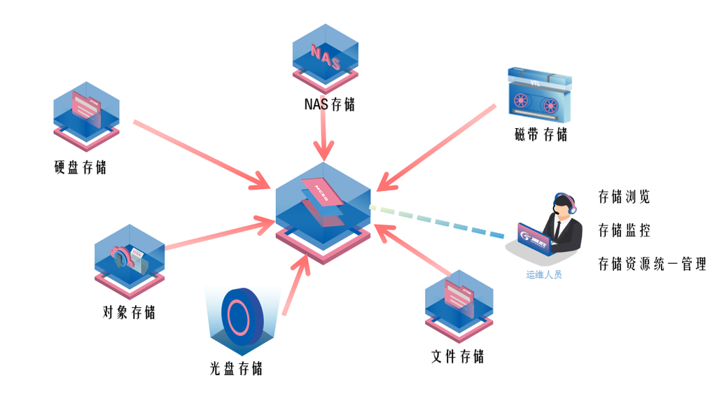 潮数多协议云存储网关支持目前市面上主流的存储资源接入,包括:磁盘存储、NAS存储、磁带存储、文件存储、光盘存储、对象存储等。使得运维人员能够对它们进行存储浏览、存储监控和存储资源统一管理,同时可以在网关接入的同时以不同的协议将这些存储资源映射出去。