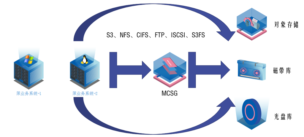潮数多协议云存储网关(Multi-Protocol Cloud Storage Gateway,MCSG)是潮数科技提供的多类型存储服务的网关类产品。用户可以通过 MCSG 使用标准文件共享协议(NFS、FTP、CIFS)或者其他的存储协议(iSCSI、S3)访问不同类型存储中的数据,无缝接入公有云、磁带库、光盘库以及其他存储,实现数据的实时共享和冷热分层。