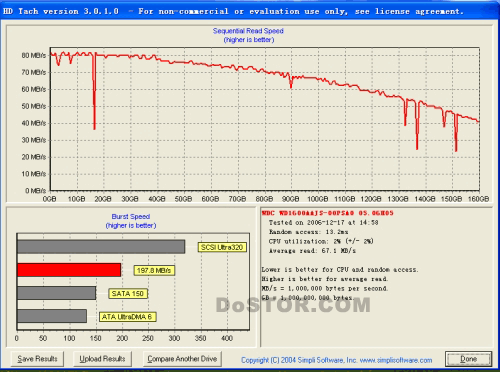 从上图的数据可以看到,硬盘的平均读取速度表现非常不错,达到了67.1MB/s,同时,在突发传输测试中,其表现更是达到了目前SATA硬盘的最高水平–197.8MB/s,但其随机存取速度相对表现一般,为13.2MB/s。另外,由于AAJS采用的是单盘片封装,因此,在上图中可以看到几次明显的跳水情况,这是由于磁头的交换工作所致,而通常在多碟片封装的硬盘中,这样的情况都不存在。