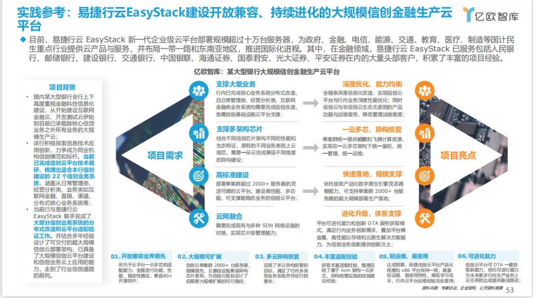 易捷行云EasyStack基于对200多家金融行业用户需求的调研发现,50%以上的金融用户会考虑把信创建设和信息化重构两步并作一步走,在信创建设的同时进行技术升级,用分布式替代集中式、云架构替代传统IT架构,业务数字化、技术分布式、平台可进化、全栈信创是金融用户信创建设的强需求。此外,70%的金融用户在数据中心信创建设上都会采用信创云,而90%的用户都有一云多芯的需求。