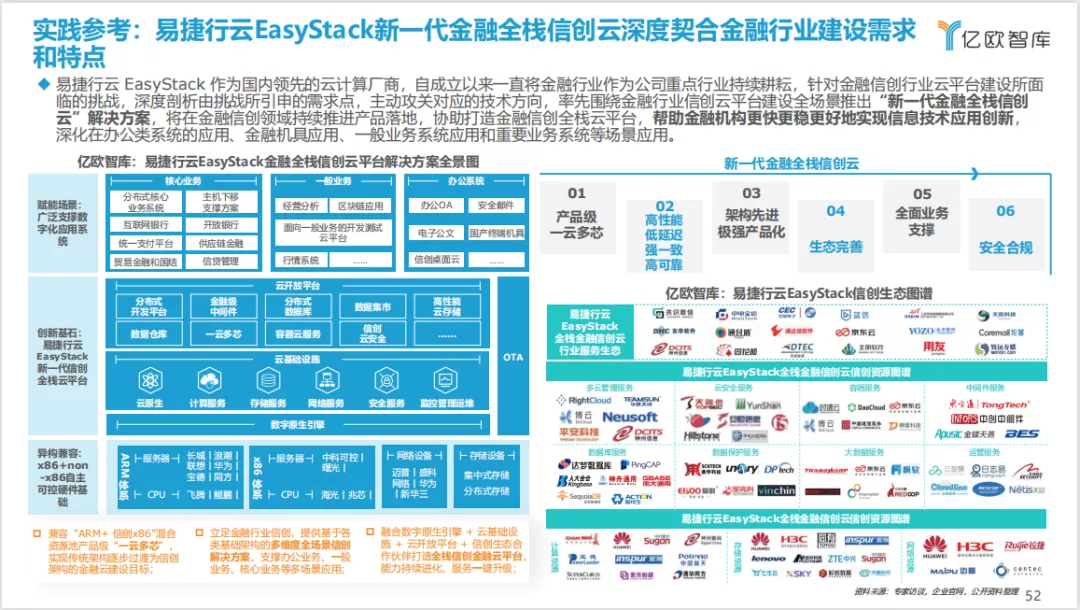 为满足金融用户建设信创云的需求,易捷行云EasyStack发布了新一代金融全栈信创云,推出永续生命周期的全栈信创云基础设施解决方案、一云多芯的开发测试云解决方案、互联网金融信创云解决方案、分布式信创云支撑主机下移解决方案、分布式核心系统云化部署解决方案、高效易用的信创云上邮件系统解决方案、按需拉取的一体化协同云办公解决方案、安全异构桌面云解决方案、金融信创云安全解决方案9大金融信创解决方案。