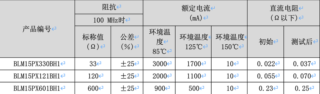 直流电阻(Rdc)低,为0.022Ω(BLM15PX330)~0.23Ω(BLM15PX601),减少了功率损耗和发热量
