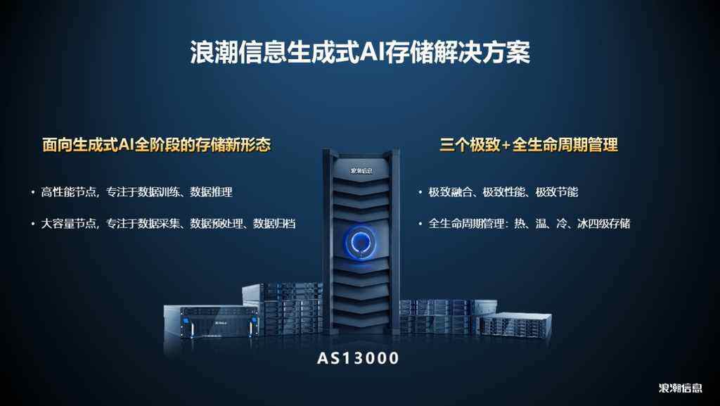 所以对于生成式AI而言,对存储多协议、大容量、高并发、高带宽的需求并存。对此,浪潮信息生成式AI存储解决方案基于AS13000融合存储系统,针对不同阶段的数据存储需求,提供热温冷冰四级存储,实现数据在各级存储间自动流转。