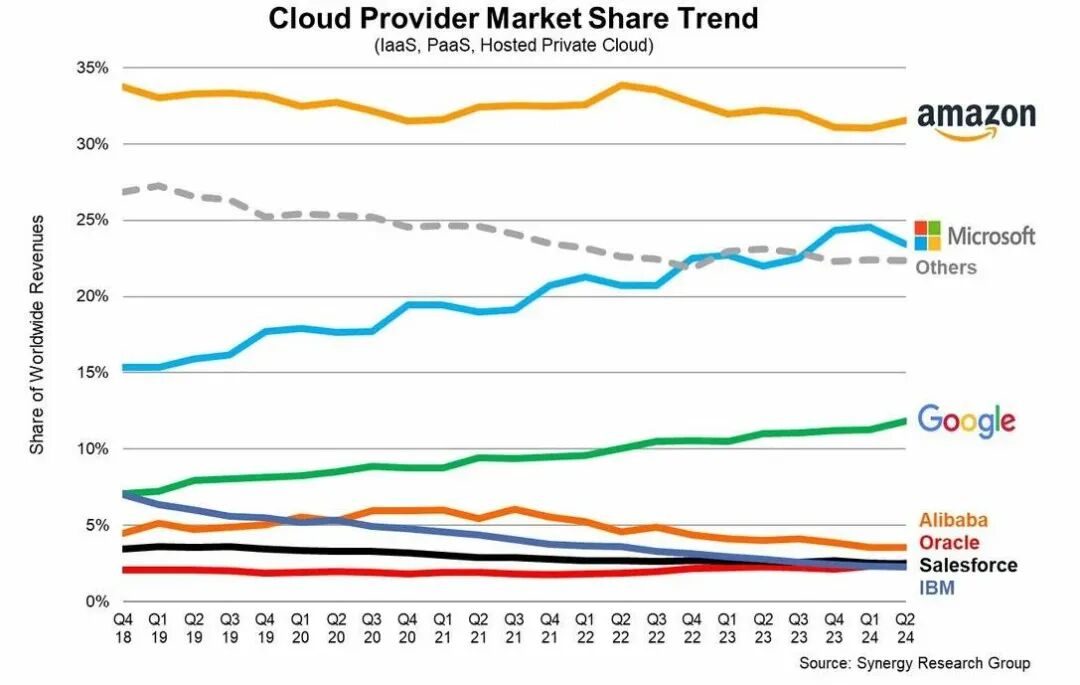 如今的公有云市场主要由Amazon Web Services (AWS)、Microsoft Azure和Google Cloud三大巨头主导,这三者合计占据了全球云市场约73%的份额。