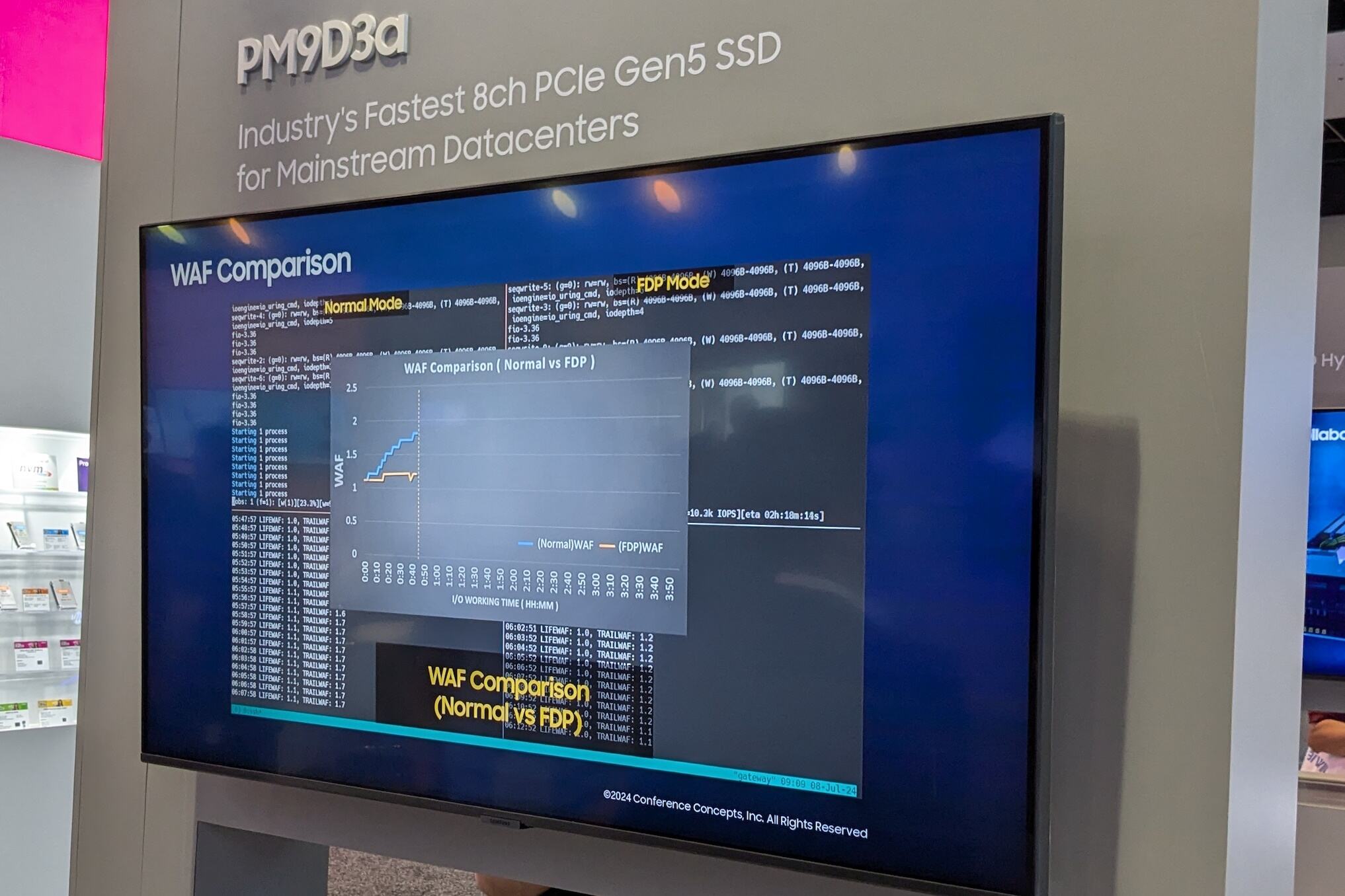 此外,三星还展示了PM9D3a 8通道Gen 5 SSD的基准测试录像。这款SSD面向主流数据中心市场,具备高达12 GB/s的顺序读取速度和6.8 GB/s的写入速度。随机读取速度为2 M IOPS,随机写入速度则为400 K IOPS。