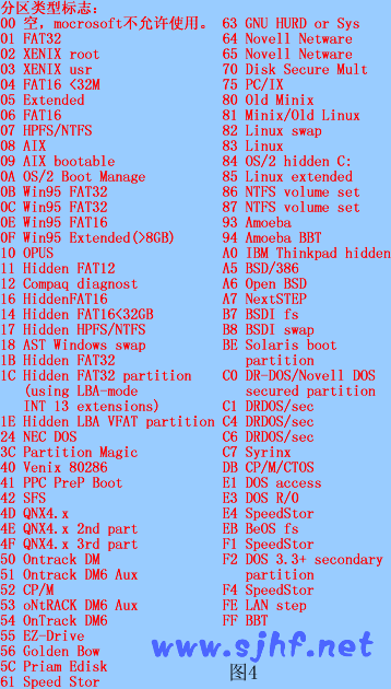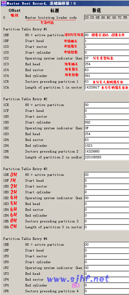 说明: 每个分区表项占用16个字节,假定偏移地址从0开始。如图3的分区表项3。分区表项4同分区表项3。