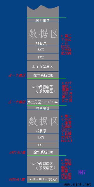 仔细研究图7中的fat16和fat32分区的组成结构。下面依次解释DBR、FAT1、FAT2、根目录、数据区、剩余扇区的概念。提到的地址如无特别提示均为分区内部偏移。