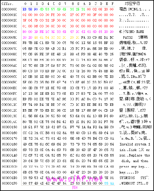 DBR的偏移0x5A开始的数据为操作系统引导代码。这是由偏移0x00开始的跳转指令所指向的。在图8所列出的偏移0x00~0x02的跳转指令”EB 58 90″清楚地指明了OS引导代码的偏移位置。jump 58H加上跳转指令所需的位移量,即开始于0x5A。此段指令在不同的操作系统上和不同的引导方式上,其内容也是不同的。大多数的资料上都说win98,构建于fat基本分区上的win2000,winxp所使用的DBR只占用基本分区的第0扇区。他们提到,对于fat32,一般的32个基本分区保留扇区只有第0扇区是有用的。实际上,以FAT32构建的操作系统如果是win98,系统会使用基本分区的第0扇区和第2扇区存储os引导代码;以FAT32构建的操作系统如果是win2000或winxp,系统会使用基本分区的第0扇区和第0xC扇区(win2000或winxp,其第0xC的位置由第0扇区的0xAB偏移指出)存储os引导代码。所以,在fat32分区格式上,如果DBR一扇区的内容正确而缺少第2扇区(win98系统)或第0xC扇区(win2000或winxp系统),系统也是无法启动的。如果自己手动设置NTLDR双系统,必须知道这一点。
