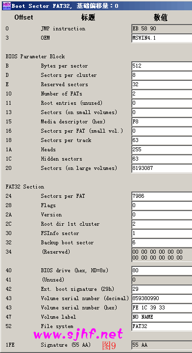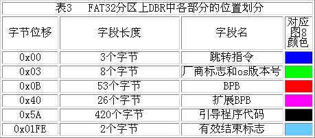 DBR区(DOS BOOT RECORD)即操作系统引导记录区的意思,通常占用分区的第0扇区共512个字节(特殊情况也要占用其它保留扇区,我们先说第0扇)。在这512个字节中,其实又是由跳转指令,厂商标志和操作系统版本号,BPB(BIOS Parameter Block),扩展BPB,os引导程序,结束标志几部分组成。 以用的最多的FAT32为例说明分区DBR各字节的含义。见图8。