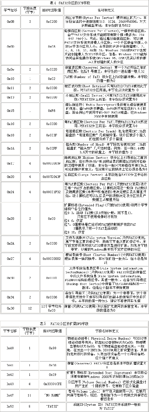 接下来的从偏移0x0B开始的是一段描述能够使可执行引导代码找到相关参数的信息。通常称之为BPB(BIOS Parameter Block),BPB一般开始于相同的位移量,因此,标准的参数都处于一个已知的位置。磁盘容量和几何结构变量都被封在BPB之中。由于引导扇区的第一部分是一个x86跳转指令。因此,将来通过在BPB末端附加新的信息,可以对BPB进行扩展。只需要对该跳转指令作一个小的调整就可以适应BPB的变化。图9已经列出了项目的名称和取值,为了系统的研究,针对图8,将FAT32分区格式的BPB含义和扩展BPB含义释义为表格,见表4和表5。