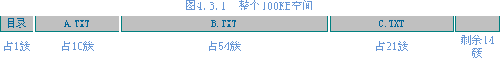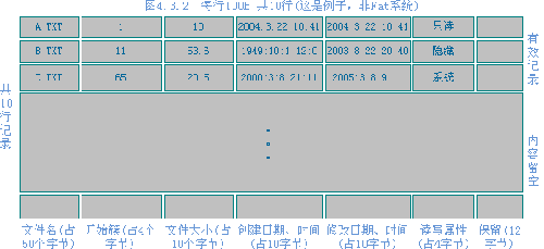 我们再考虑如何来写这三个文件的目录。对于每个文件而言,一定要记录的有:文件名,开始簇,大小,创建日期、时间,修改日期、时间,文件的读写属性等。这里大小能不能用结束簇来计算呢?一定不能,因为文件的大小不一定就是整数个簇的大小,否则的话像B.TXT的内容就是54KB的内容了,少了固然不行,可多了也是不行的。那么我们怎么记录呢?可以想象一下。为了管理上的方便,我们用数据库的管理方式来管理我们的目录。于是我把1KB再分成10份,假定开始簇号为0,定义每份100B的各个位置的代表含义如图4.3.2