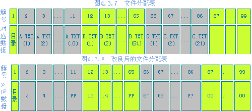 用图4.3.7的组织方式是完全可以实现对文件占有簇的记录的。但还不够效率。比如文件名在文件分配表中记录太多,浪费空间,而实际上在目录中已经记录了文件的开始簇了。所以可以改良一下,用链的方式来存放占有簇的关系,变成图4.3.8的组织方式。