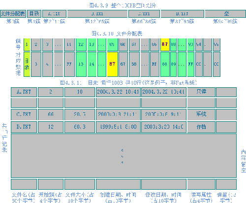 参照图4.3.8来理解一下文件分配表的意义。如文件a.txt我们根据目录项中指定的a.txt的首簇为2,然后找到文件分配表的第2簇记录,上面登记的是3,我们就能确定下一簇是3。找到文件分配表的第3簇记录,上面登记的是4,我们就能确定下一簇是4……直到指到第11簇,发现下一个指向是FF,就是结束。文件便丝毫无误读取完毕。