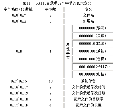 不管目录文件所占空间为多少簇,一簇为多少字节。系统都会以32个字节为单位进行目录文件所占簇的分配。这32个字节以确定的偏移来定义本目录下的一个文件(或文件夹)的属性,实际上是一个简单的二维表。