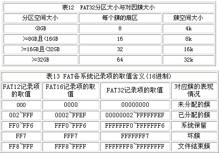 分区变大时,如果簇很小,文件分配表也随之变大。仍然会有上面的效率问题存在。既要有效地读写大文件,又要最大可能的减少空间的浪费。FAT32同样规定了相应的分区空间对应的簇的大小,见表12: