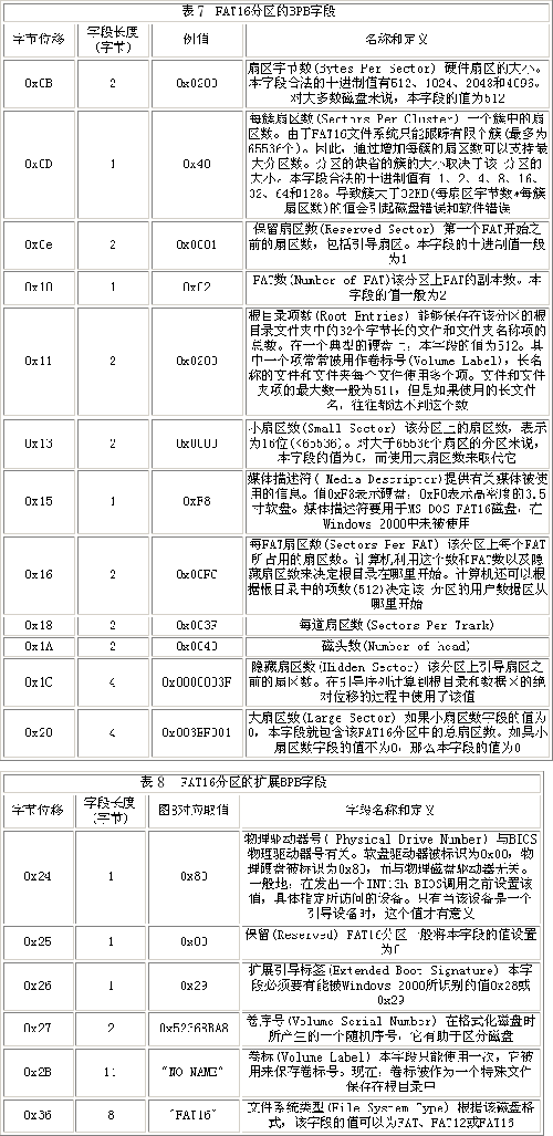FAT32在格式化的过程中就根据分区的特点构建好了它的DBR,其中BPB参数是很重要的,可以回过头来看一下表4和表5。首先FAT32保留扇区的数目默认为32个,而不是FAT16的仅仅一个。这样的好处是有助于磁盘DBR指令的长度扩展,而且可以为DBR扇区留有备份空间。上面我们已经提到,构建在FAT32上的win98或win2000、winXP,其操作系统引导代码并非只占一个扇区了。留有多余的保留扇区就可以很好的拓展OS引导代码。在BPB中也记录了DBR扇区的备份扇区编号。备份扇区可以让我们在磁盘遭到意外破坏时恢复DBR。