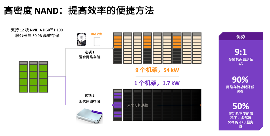 过去需要9个机架、功耗高达54kW的英伟达DGX系统,在采用高密度QLC SSD后,仅需1个机架、1.7kW功耗即可满足需求。网络存储功耗锐减90%,或者在功耗不变的情况下,额外多部署50%的GPU服务器。