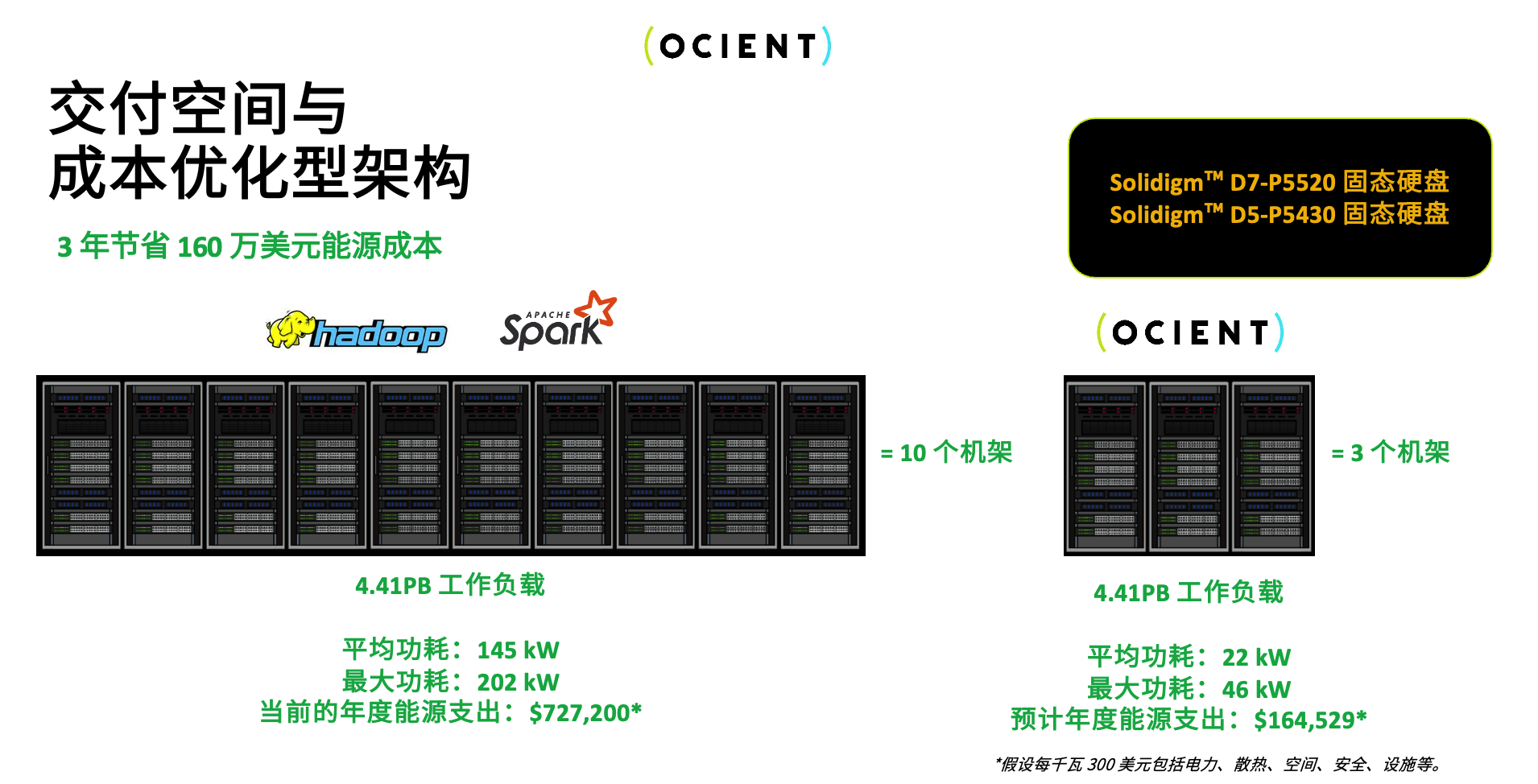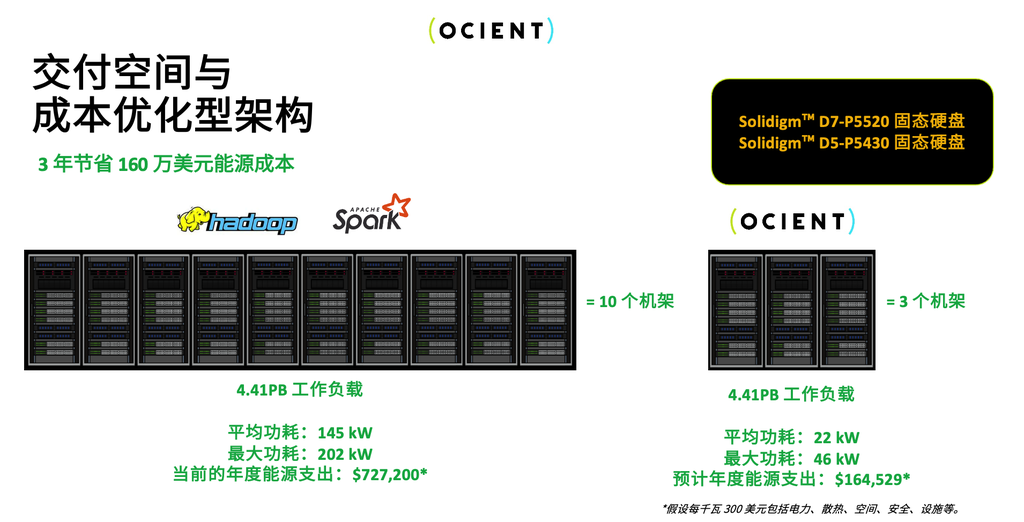 全球领先的数据解决方案服务商OCIENT的实践也印证了这一点。通过采用Solidigm的大容量QLC方案,OCIENT成功将其数据处理平台的机架空间节省了70%以上,功耗降低超过77%。