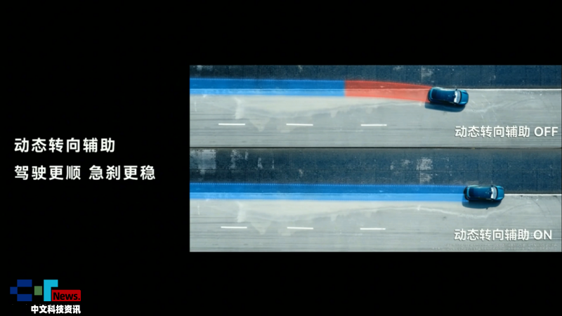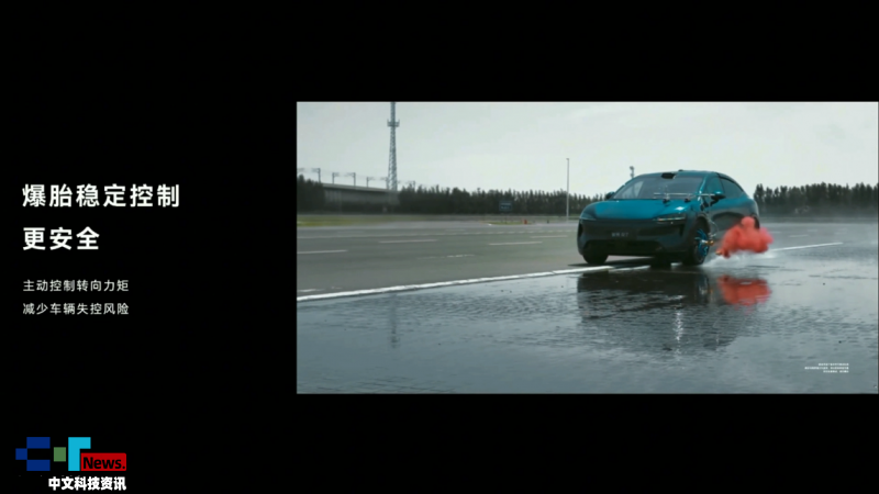 而另一个场景,难度继续升级,在对开路面以120km/h时速行驶,引爆前胎,结果车身依然按直线行驶,并稳稳刹停!