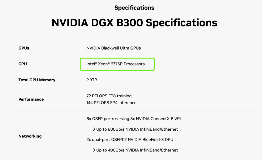 此前两家已有了一些合作。2025年5月,英特尔发布了三款全新英特尔至强6性能核处理器,其中一款6776P被用作是DGX B300的主控CPU,选择英特尔至强 6,说明它在I/O、内存、协同能力等方面满足了DGX B300的苛刻需求。