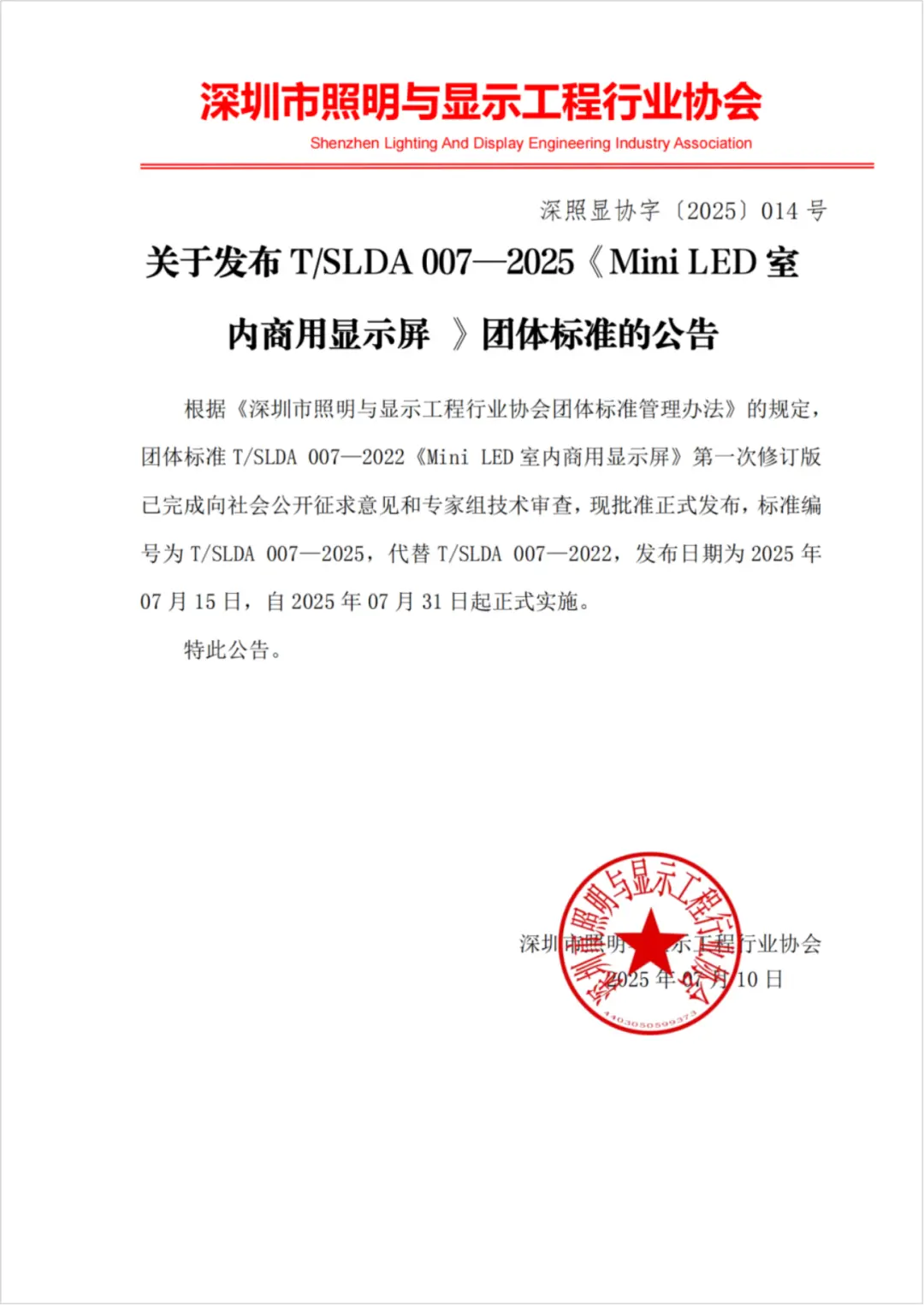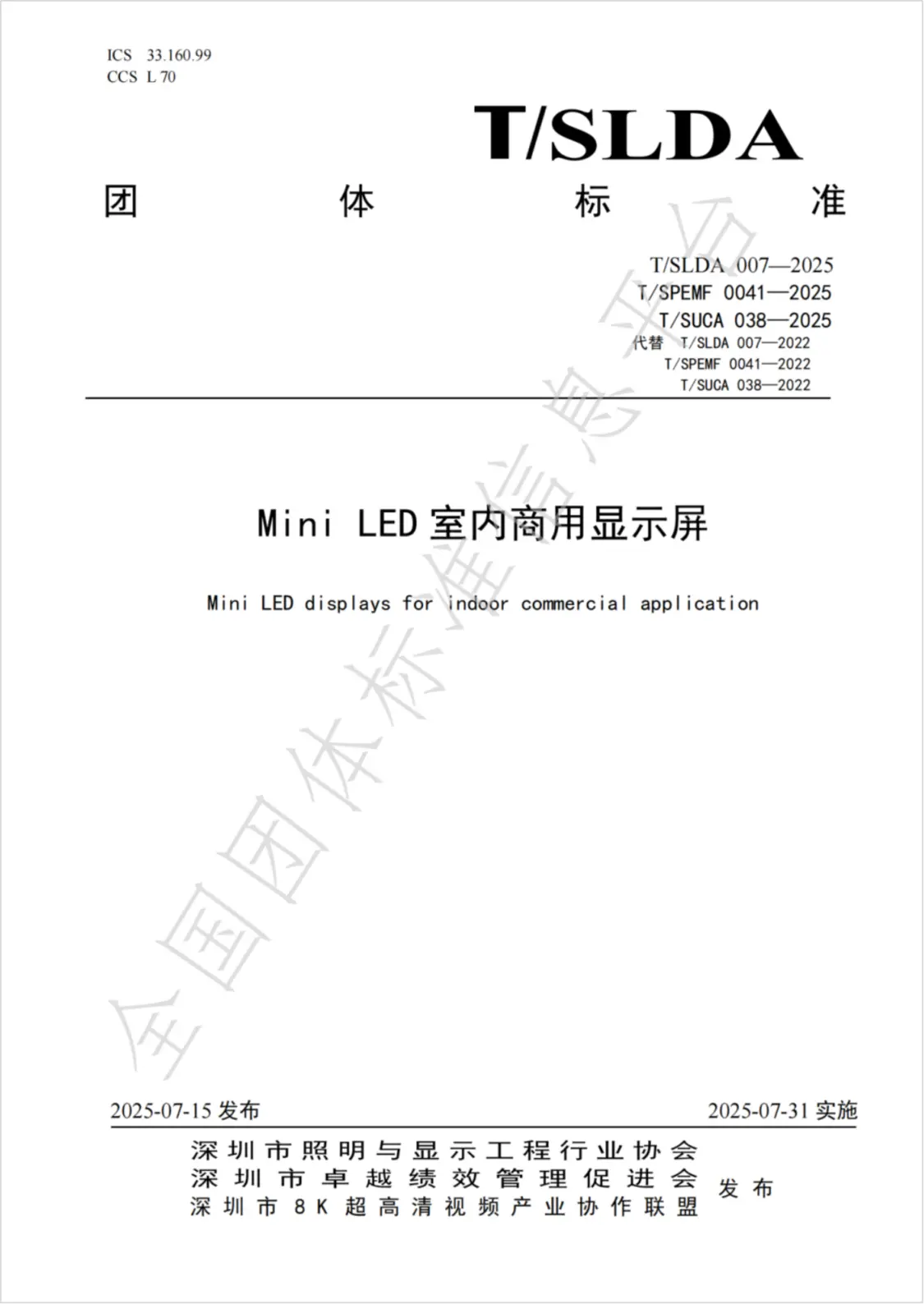 在全球新型显示技术加速演进、市场规模持续扩大的背景下,Mini LED室内商用显示领域迎来具有里程碑意义的重要时刻。2025年7月15日,由深圳市照明与显示工程行业协会、深圳市卓越绩效管理促进会、深圳市8K超高清视频产业协作联盟归口的《Mini LED室内商用显示屏》团体标准(T/SLDA 007-2025、T/SPEMF 0041-2025、T/SUCA 038-2025)正式发布,并于7月31日实施。