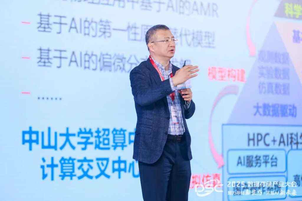 中山大学计算机学院教授肖侬分享了科学工程计算的前沿趋势,即通过高性能计算与AI for Science的融合实现突破。结合广州超算中心的实践,他展示了“超智融合”模式下的存储挑战,并解读了相应的高性能存储技术与体系架构的创新发展。