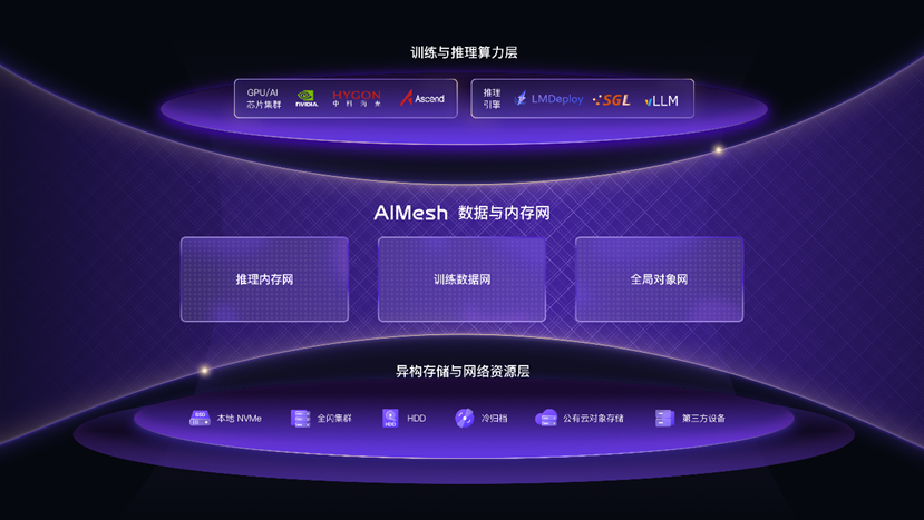 让我们具体看看AIMesh的这些产品,AIMesh被称为数据与内存网,包括:训练数据网MeshFS、全局对象网MeshSpace和推理内存网MeshFusion,是一个“三网合一”的创新架构。