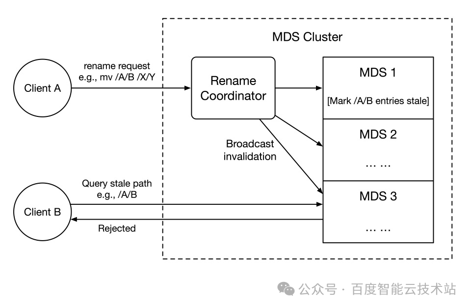 - Rename 操作引发的全局广播开销:目录重命名操作要求系统必须通过 Rename Coordinator 节点广播通知所有元数据节点(MDS)废弃相关缓存。在大规模集群中广播开销是灾难性的,且性能会随着节点的增多进一步退化。