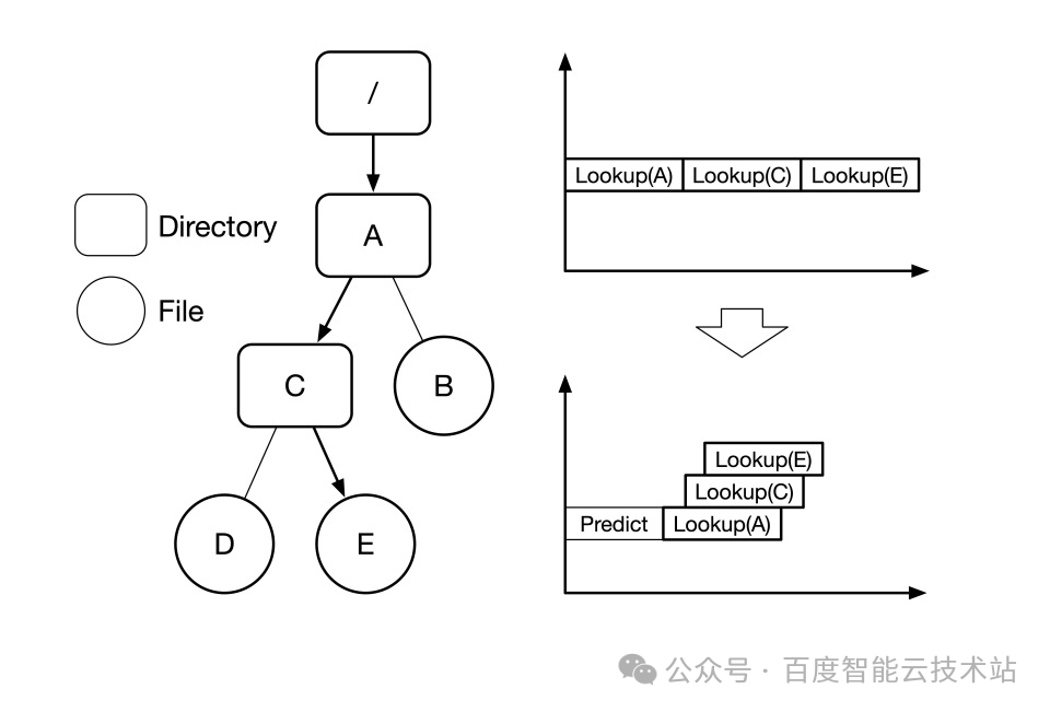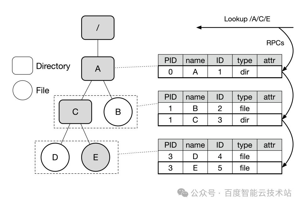- 路径解析高开销:路径上的每一层目录元数据可能分布在不同服务器上,路径解析必须依次进行多轮 RPC 交互,如下图所示,lookup /A/C/E 可能导致 3 次 RPC:客户端先基于已知的根目录 ID 远程查询 A,拿到 A 的 ID(RPC 1),再用 A 的 ID 远程查询拿到 C 的 ID(RPC 2),最后才能查到 E(RPC 3)。这种跨节点、串行的「接力式」查找,使得 RPC 次数随着路径深度线性增长,导致延迟居高不下。