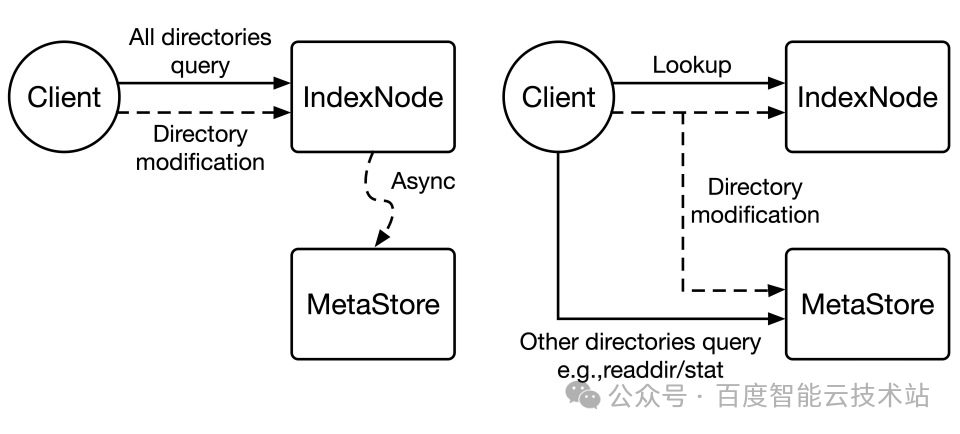 - 路径 1:异步更新(最终一致性)对目录修改操作友好,但代价是 MetaStore 的数据永远滞后。这迫使 IndexNode 必须成为目录元数据的唯一可信源,不仅要负责路径解析,还得独自承载 readdir 和 stat 等所有目录查询流量。