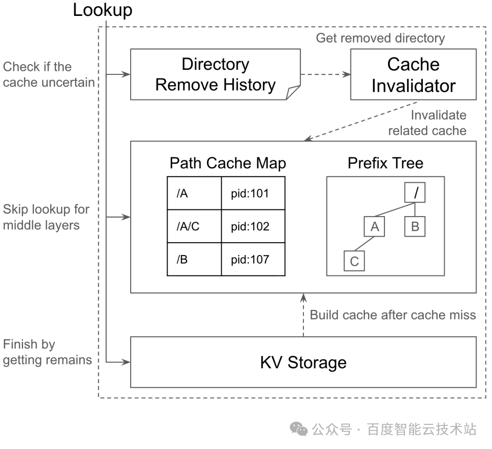 - 内存缓存(TopDirPathCache):采用全路径 Key 方案。我们将这 5% 的稳定路径前缀缓存在内存中,实现了 lookup 前缀解析的 O(1) 效率。