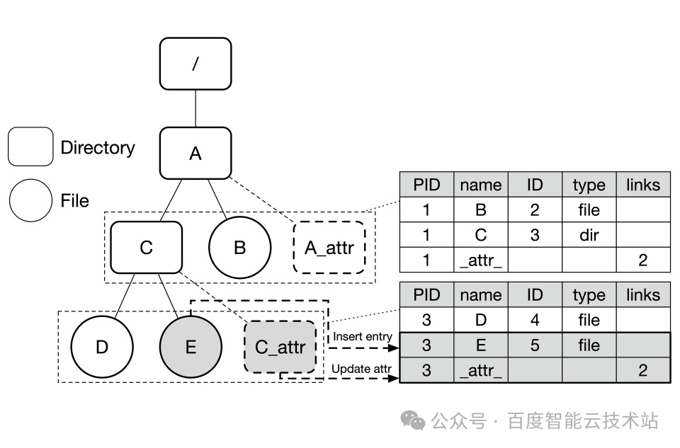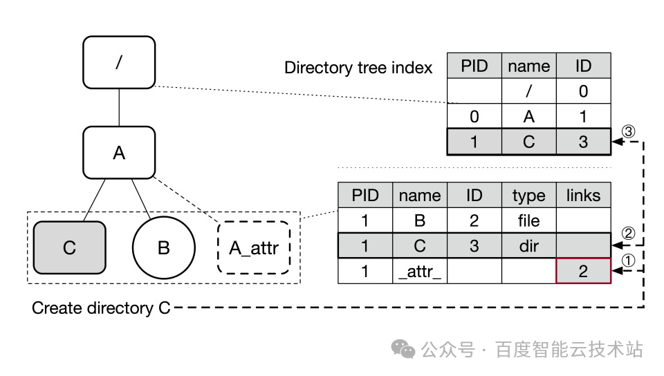 如下图所示,假设目录 C 的 ID 为 3,其父目录 ID 为 1。目录 C 的属性被剥离出来,作为一个特殊的子节点存储,Key 为 <ParentID=1, Name=”/_ATTR”>。