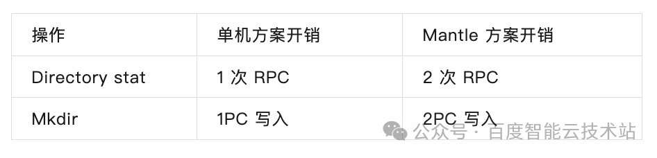 由于 Mantle 引入了额外的索引表来加速路径解析,即便用户的元数据单机能存放,在 TafDB 中也会存在两个分片,和单机方案相比就带来了额外的开销,这里举两个例子: