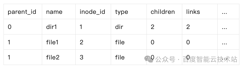 - 主键:<parent_id, name>,负责实现 lookup 和 readdir。