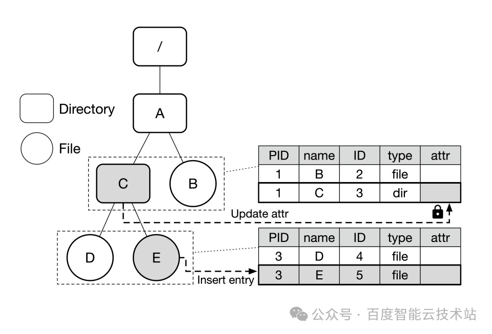 新文件 E 的元数据 Key 为 <ParentID=1, Name=”E”>。结果:利用 TafDB 的分片策略(Policy-based Sharding),所有 ParentID=1 的记录被强制分配在同一个物理分片中。因此,更新 /_ATTR 和插入 E 变成了 单分片 1PC 事务。