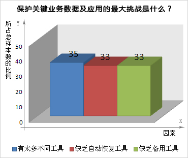 虚拟化是导致全球过半 (55%)企业重新评估其灾难恢复计划的主要原因,而在北美洲这一比例达到64%。在某些情况下,实现虚拟化是为了进行灾难恢复,由于针对物理环境下使用的方法在虚拟环境中可能不起作用,所以对部属虚拟环境中的应用和数据提出了极大挑战。此外,虚拟环境中的本地灾难恢复工具不成熟,不能提供组织所需的企业级防护。35%的受访者表示,目前他们的虚拟服务器未包含在灾难恢复计划中,只有37%的受访者表示已备份了所有虚拟系统。五分之四的受访者认为资源限制是备份虚拟系统的最大难题,解决这一难题需要简化和自动化解决方案。在全球范围内,35%的受访者称,有太多不同工具,是在物理和虚拟环境中保护关键业务数据及应用的最大挑战。 >>更多进入