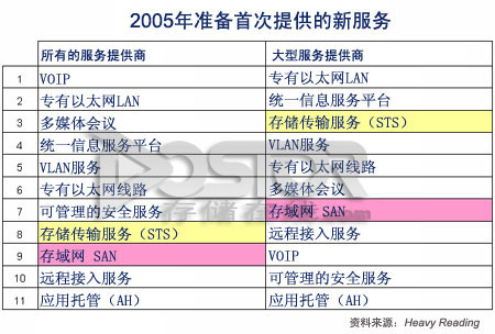 其次,调研数据表明,SAN和STS服务更多地受到大型运营商的关注。统计显示STS在服务提供商准备2005年首次提供的业务重要性排名第八。然而在大型服务提供商(那些员工数超过5,000的机构)该项调研显示STS重要性排名第三,该项调研数据由30%的受访者回馈结果得出。