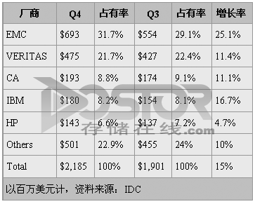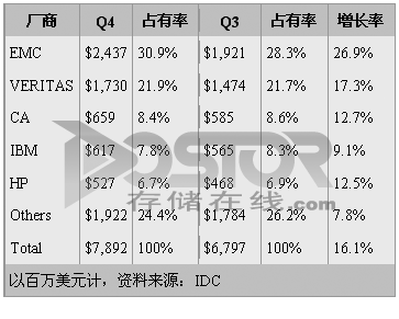 EMC软件市场增长率达25.1%,超过整体市场增长速度。IBM增长率为16.7%,是除EMC之外,第四季度该市场区隔超过平均增长率的唯一厂商。相比之下IDC数据显示IBM的硬件销售略显不足,硬件市场方面,IBM排名第四,占8.2%,几与其前一季度8.1%市场份额持平。